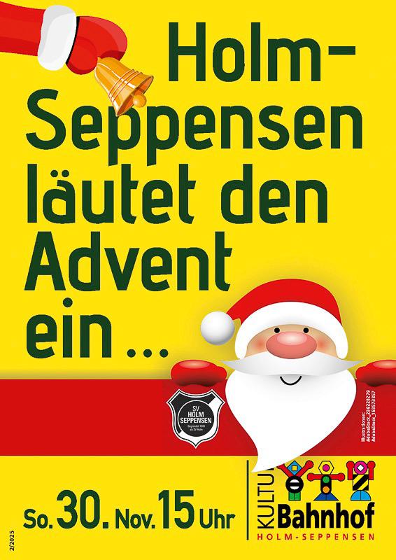 Kulturbahnhof olm-Seppensen Bahnhofsweg 4, Holm-SeppensenHolm-Seppensen läutet den Advent ein! Kommt am Sonntag zum Kulturbahnhof in Holm-Seppensen und beginnt mit uns die Adventszeit. Für Euer leibliches Wohl und weihnachtliche Unterhaltung ist gesorgt. Es gibt Glühwein, alkoholfreien Punsch, Bratwurst, Grillsteaks und natürlich auch frische, heiße Waffeln und Kuchen. Zusammen mit dem Kulturbahnhof freuen wir uns auf Euch!