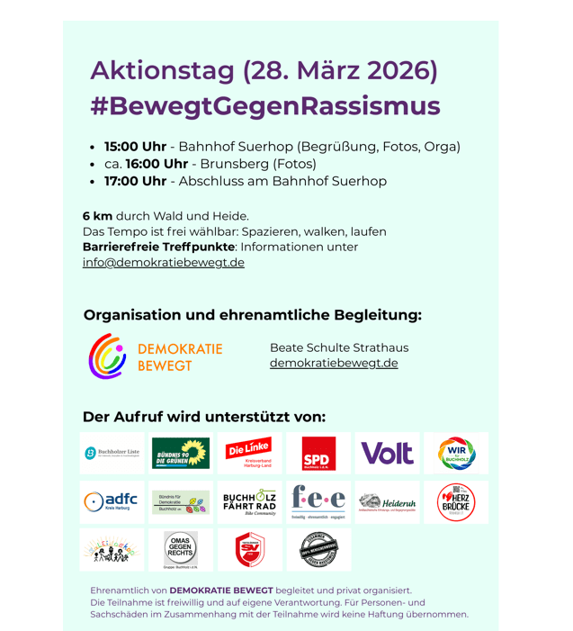 Im Rahmen der Internationalen Wochen gegen den Rassismus organisiert die Buchholzer Gruppe #Demokratie bewegt einen gemeinsamen Lauf zum Brunsberg.